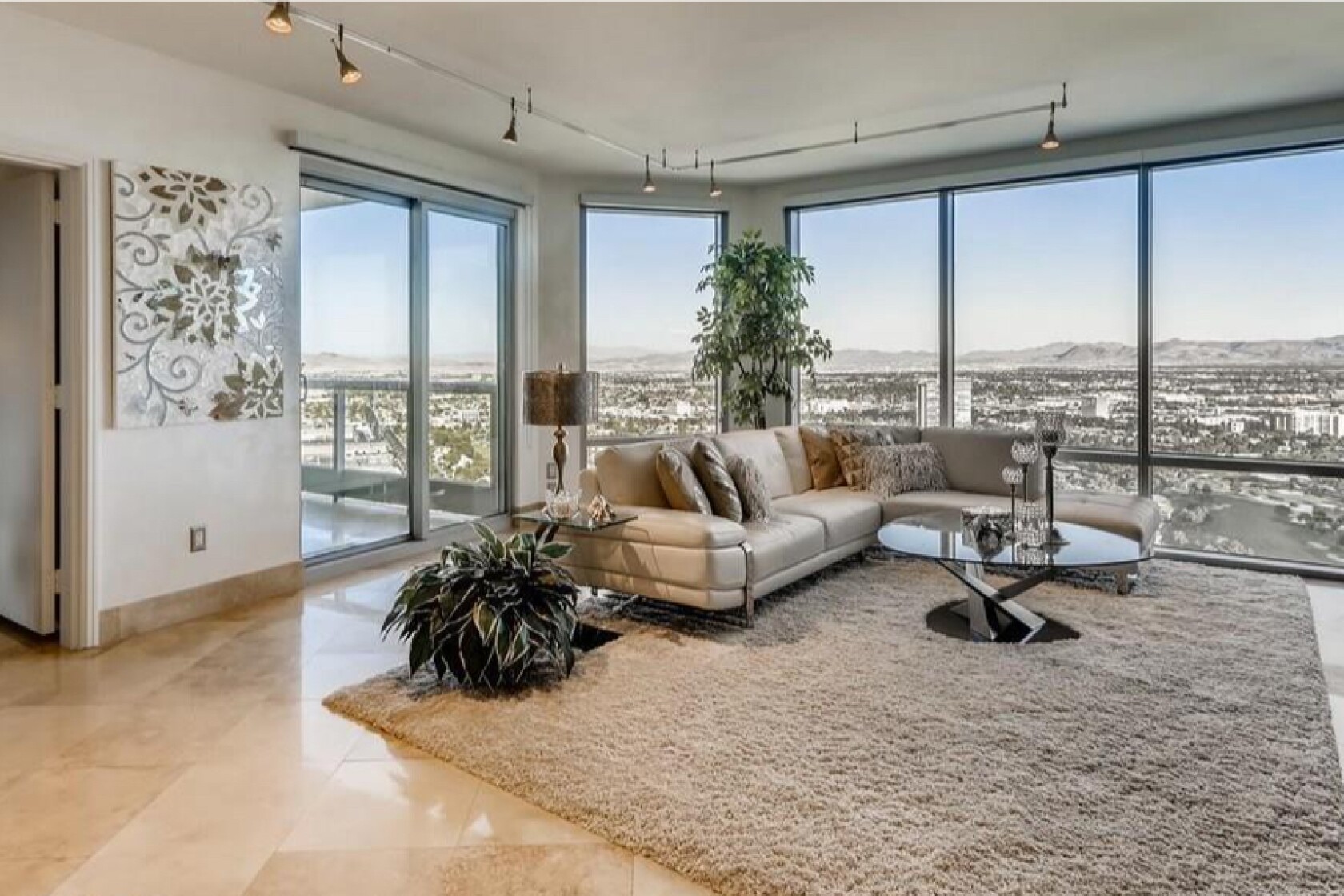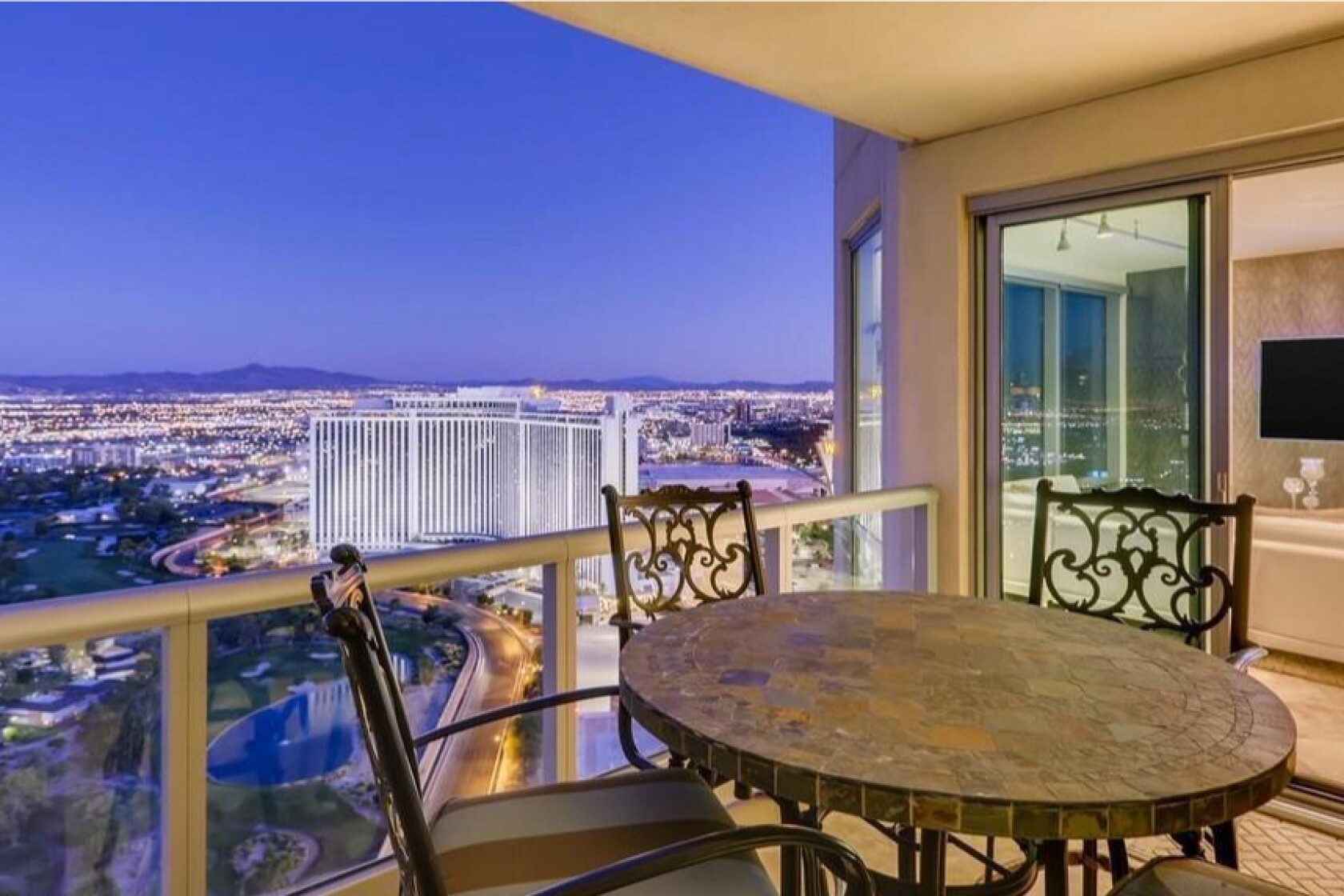 The unit is perched on the 36th floor of Turnberry Towers, a 45-story condo complex near the Las Vegas Strip. Walls of windows take in sweeping views of the city and mountains, and a pair of balconies offer outdoor space.