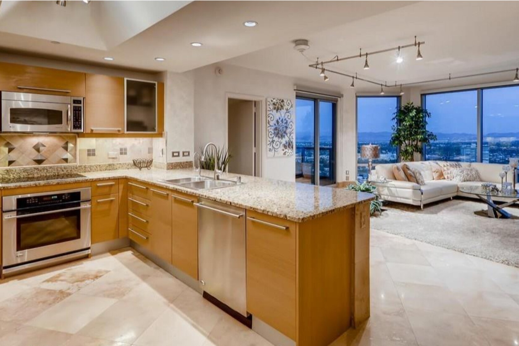 Track lighting lines the living room, and the adjacent kitchen tacks on granite countertops and custom cabinetry. Two bedrooms and two bathrooms complete the 1,400-square-foot floor plan, including a guest suite with a murphy bed.