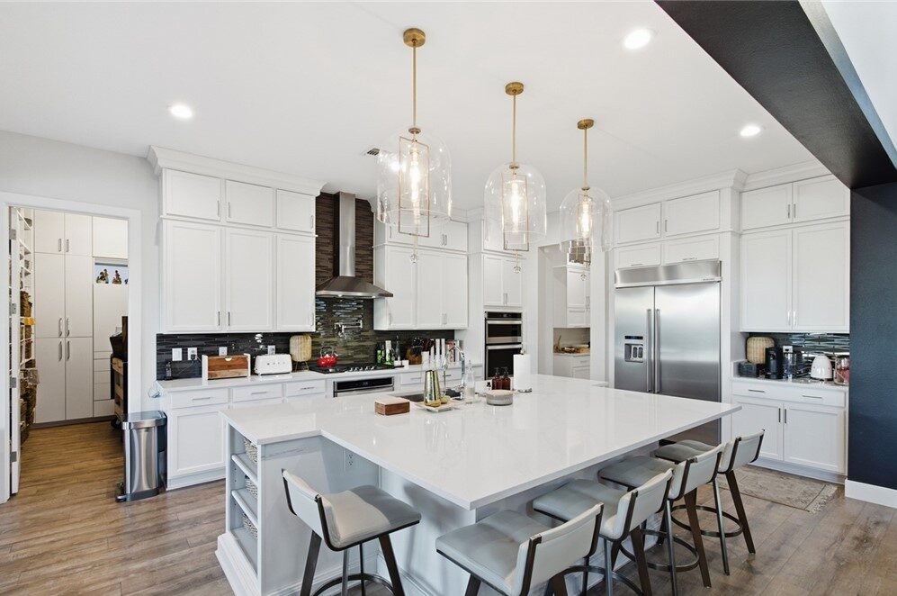 The kitchen serves as a dazzling focal point, featuring quartz countertops, a custom designer backsplash, and a meticulously crafted custom butler’s pantry that elevates both style and functionality. Whether hosting or enjoying an intimate dinner at home, this culinary space delivers a seamless blend of beauty and purpose.