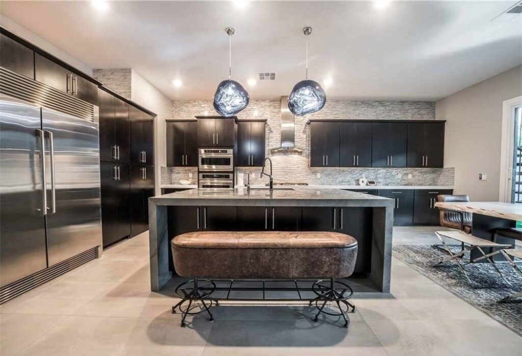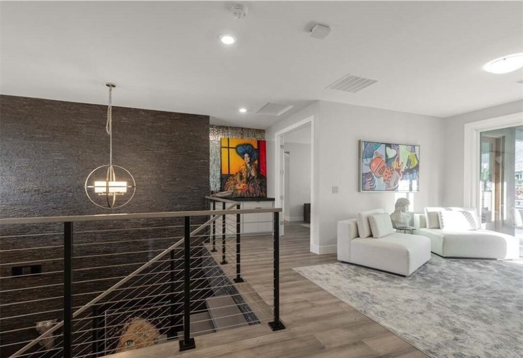 From the moment you arrive, the grand entry makes a powerful statement, highlighted by a custom floating staircase that sets the tone for the contemporary elegance found throughout the home. Inside, the open-concept layout is flooded with natural light and enhanced by vaulted ceilings, large-format tile flooring, and meticulously curated finishes that reflect an uncompromising attention to detail. Every space has been upgraded to the highest level, creating a seamless balance of style and comfort.