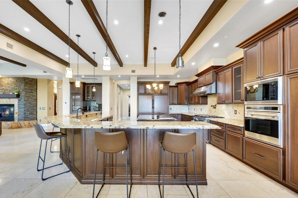 Equipped with two ovens, an oversized refrigerator, two islands, three sinks, a wine refrigerator, gas cooktop, second oven, and built-in microwave, this kitchen is a culinary powerhouse. Abundant cabinetry and storage ensure everything has its place, making the space as functional as it is visually striking.