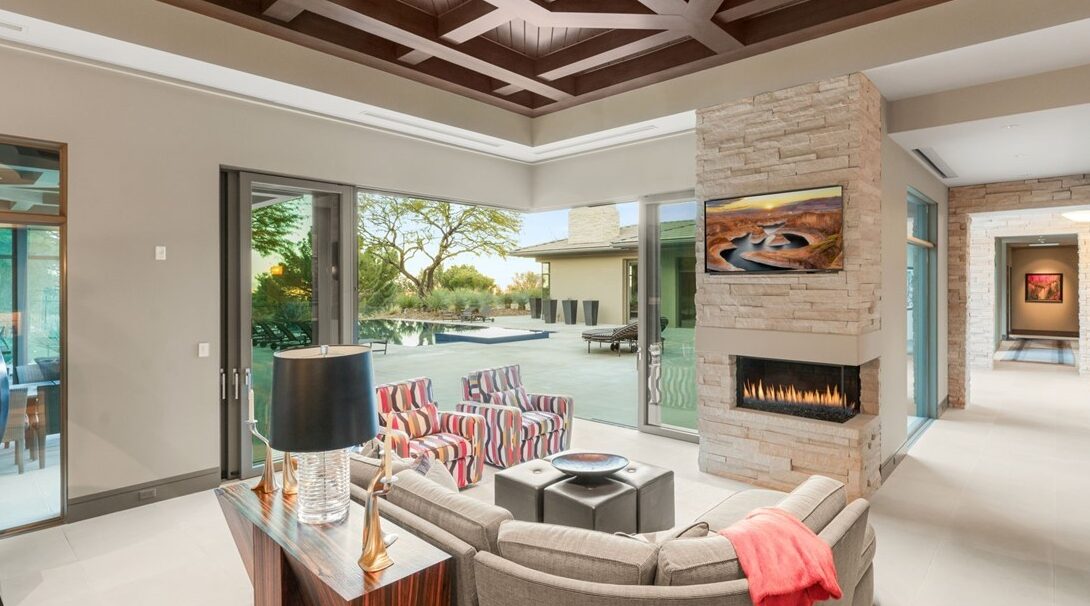 The primary suite serves as a private sanctuary, complete with its own fireplace and captivating views that stretch across the course and toward the illuminated Strip. Designed for tranquility and privacy, it offers a retreat-like setting that feels both elevated and serene.